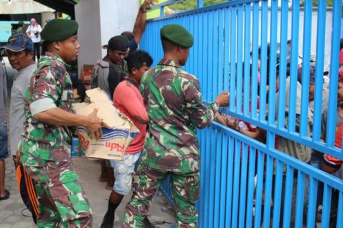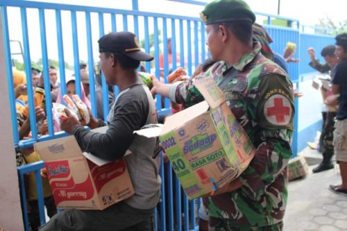 Palu – Dengan dikawal kendaraan patroli milik Polres Kota Palu, truk pengangkut bantuan untuk para pengungsi datang pagi ini Kamis, (4/10/2018). 10 menit sebelum sampai Regu perhubungan Satgasgab sudah divoice lewat radio SSB yang mereka miliki oleh salah satu anggota pengawal dari Polres Kota Palu agar membantu pengamanan dan distribusi bantuan tersebut.