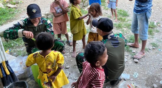 Belu – Personel Pos Lookeu Satgas Pamtas RI–RDTL Sektor Timur dari Yonarmed 12 Kostrad melaksanakan kegiatan pembagian bubur kacang hijau kepada masyarakat