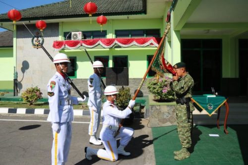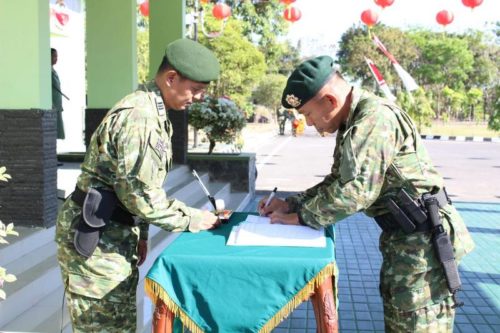 Surakarta – Komandan Brigade Infanteri Mekanis Raider 6/TSB/2 Kostrad, Kolonel Inf Rudy Saladin memimpin tradisi penerimaan calon Danbrigif Mekanis Raider 6/TSB/2 Kostrad Letkol Inf Ade David Siregar, S.I.P di Mabrigif Mekanis Raider 6/TSB/2 Kostrad, Sukoharjo, Surakarta. (21/8).