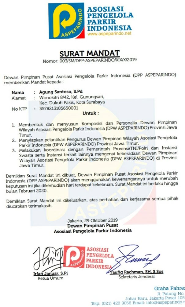 Surabaya – Agung Santoso yang dikenal sebagai Ketua Umum MOI (Media Online Indonesia) Jawa Timur, kembali dipercaya menjadi Ketua DPW Aspeparindo (Asosiasi Pengelola Parkir Indonesia) Pribadi Jawa Timur.