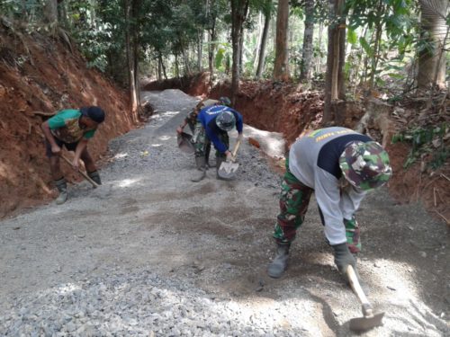Sejumlah Anggota Satgas membersihkan,merapikan meratakan Gundukan batu Split TMMD yang ada di tengah jalan untuk jadikan satu agar tidak menghalangi proses pengaspalan dan pemadatan mesin Slender.
