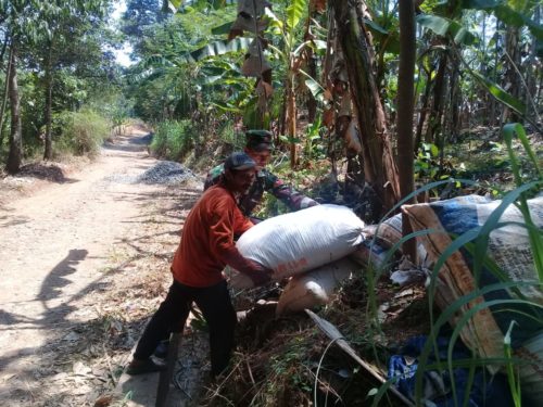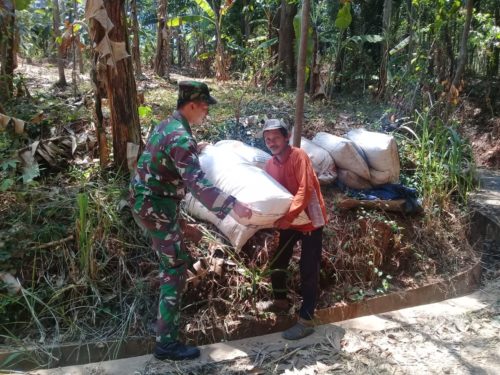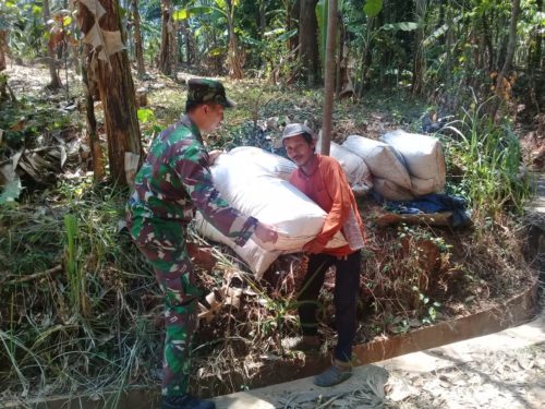 Koptu Slamet, anggota Satgas TMMD yang mengetahui hal tersebut langsung beranjak dari posisinya dan langsung membantu mengangkat karung berisi pupuk kandang. Meski mengaku sudah terbiasa memanggul karung berisi pupuk kandang, namun Poniran (60 th) tak kuasa menolak uluran tangan Koptu Slamet.