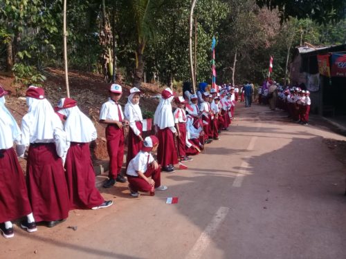 Seperti yang dilakukan anak-anak dari SDN 1 Durenombo,pada Senin pagi 15 Oktober 2018, mereka berjejer rapi di jalan untuk menyambut kedatangan para tamu undangan yang akan menghadiri upacara pembukaan TMMD yang ada di Desanya.