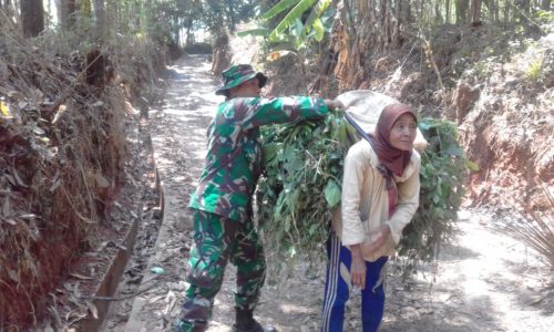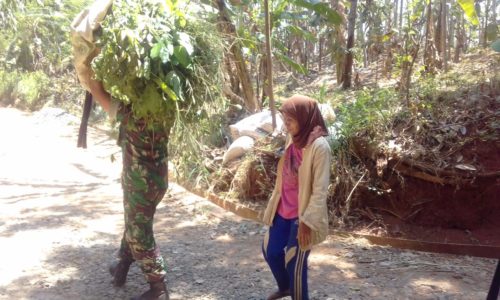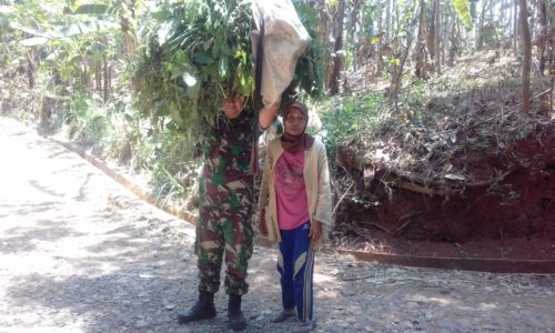 Sebentar tertegun, laki-laki yang sedari tadi ditatapnya tiba-tiba sudah berada di depanya sambil menyorongkan kedua tanganya ke arah punggung. “Mari saya bantu mengangkat rumputnya mbah,” tawar laki-laki gempal yang ternyata adalah, Serda Maafi, anggota Satgas TMMD yang Sabtu (13/10/18) pagi itu sedang berada di lokasi kerja.