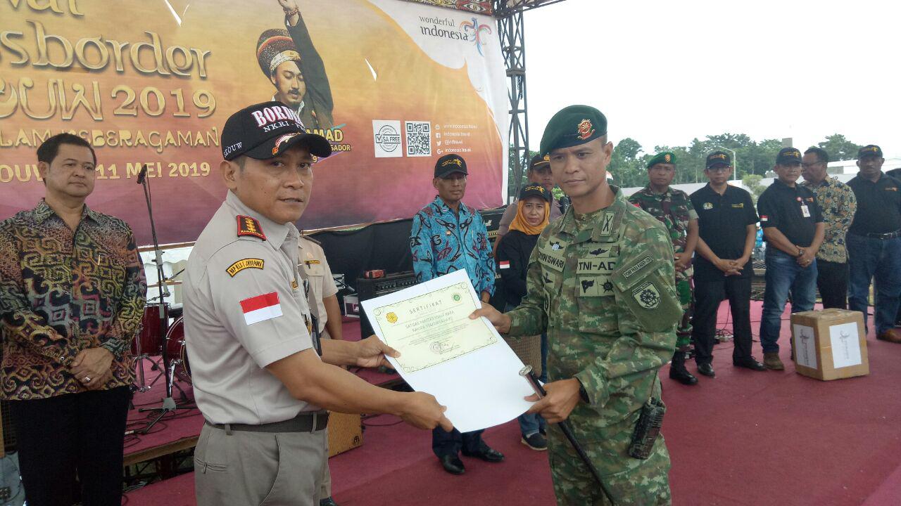 Dalam pembukaan kegiatan Festival Crossborder Skouw 2019 tersebut, Satgas Pamtas menerima dua penghargaan dari Kedutaan Besar RI untuk PNG dan Kepulauan Salomon serta dari Balai Karantina Kesehatan Pertanian, “Pertama kami terima penghargaan dari Dubes RI Bapak Andriana Supandy yang diserahkan langsung kepada Satgas, Bapak Dubes mengapresiasi kinerja kami selama bertugas di wilayah perbatasan dalam mencegah masuk dan keluarnya barang-barang illegal serta pelintas batas illegal,” ucapnya.