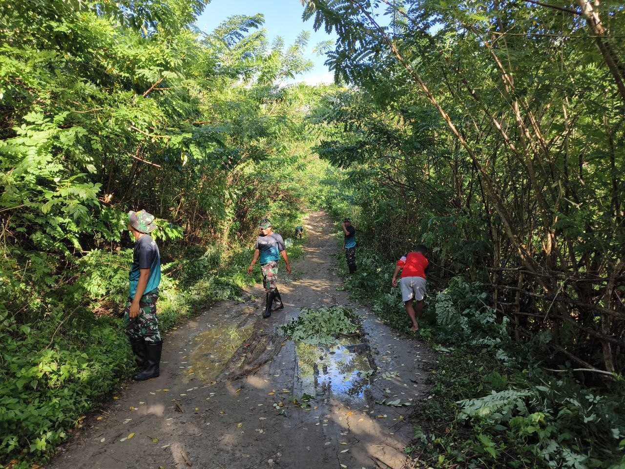 TTU – Satgas Pamtas RI-RDTL Sektor Barat Yonarhanud 2 Kostrad Pos Manamas melaksanakan kegiatan karya bakti dengan melakukan pembersihan jalan bersama warga perbatasan yang berada di Desa Manamas, Kecamatan Naibenu, Kabupaten TTU, Kamis (16/04/2026).