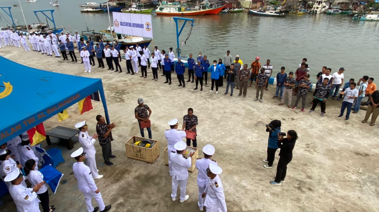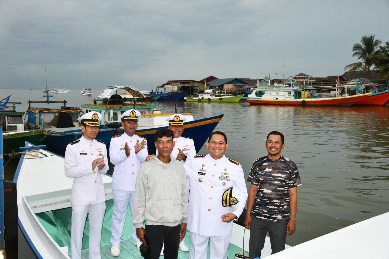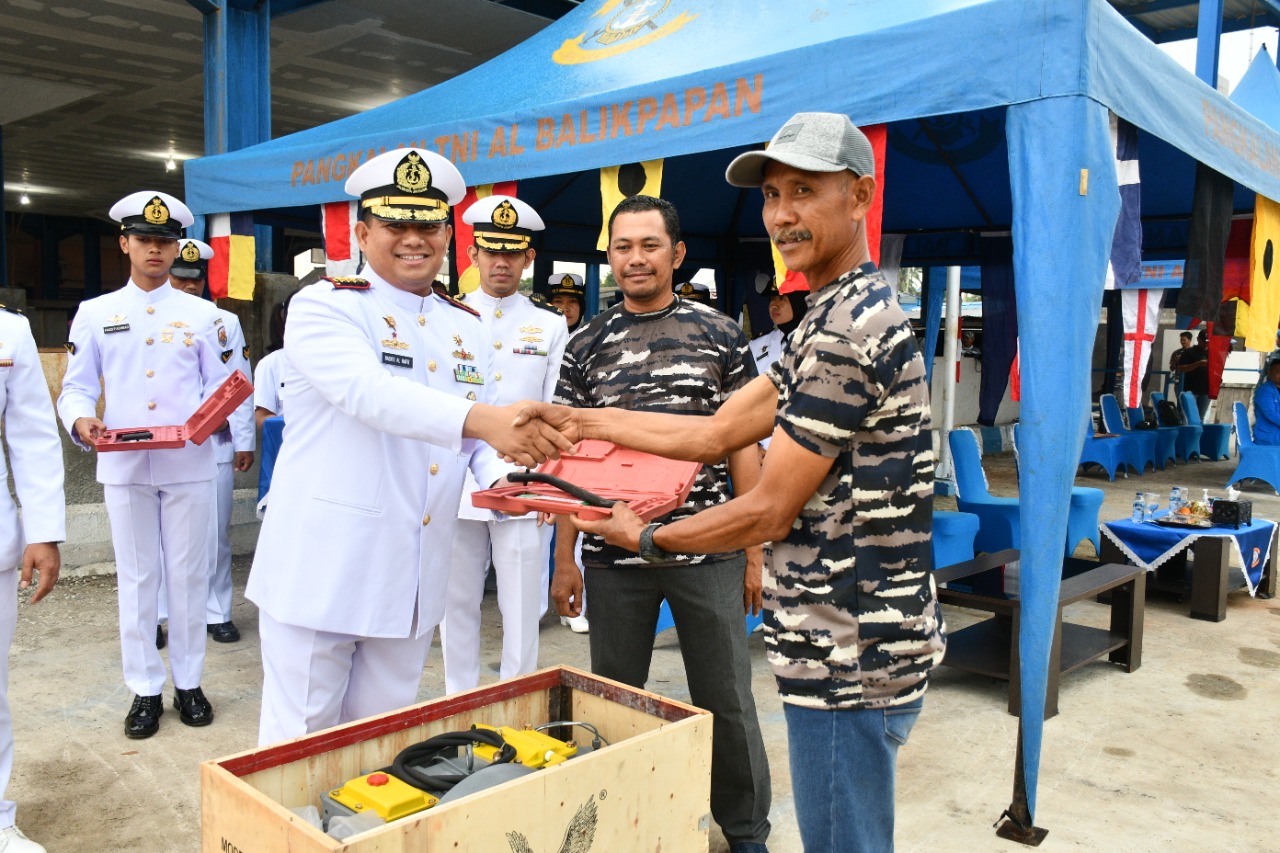 Usai pelaksanaan upacara bendera Danlanal Balikpapan Kolonel Laut (P) Rasyid Al Hafiz, MMaritimePol., M.Tr. Hanla menyerahkan kapal hasil bedah kapal nelayan dan memberikan 2 motor kapal kepada nelayan Manggar.