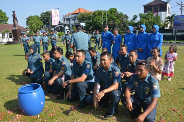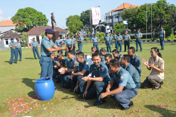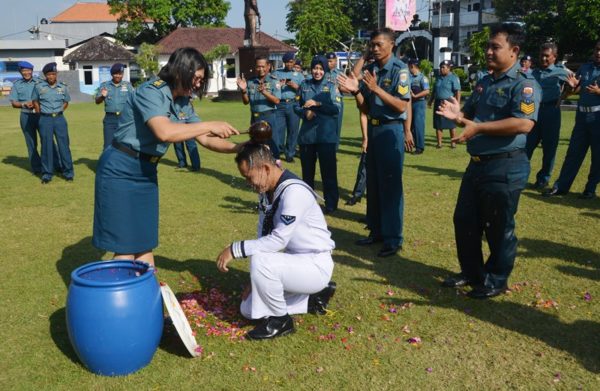 PB|Denpasar – Biur, beberapa gayung air bercampur kembang Perwira Pelaksana (Palaksa) Pangkalan TNI Angkatan Laut (Lanal) Denpasar, Lantamal V, Palaksa Lanal Denpasar Mayor Laut (P) Bambang Abdulah Basuki Rahmad menyiramkan air ke bagian tubuh anggotanya usai menerima Laporan Kenaikan Pangkat Prajurit Lanal Denpasar di Markas Komando (Mako) Lanal Denpasar Jalan Raya Sesetan 331 Denpasar Bali, Selasa (10/4). Ada 17 prajurit yang menerima kenaikan pangkat pada kala waktu 1 April 2018 ini, mereka terdisi dari delapan orang bintara, delapan orang tamtama, dan datu orang PNS.