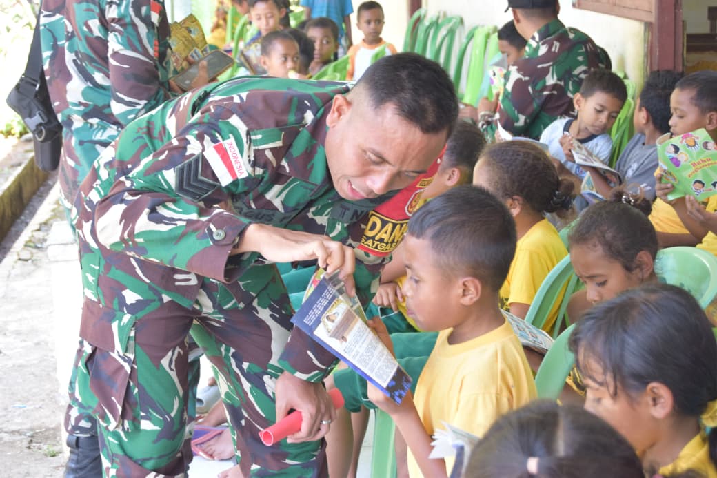 Kehadiran prajurit Satgas disambut antusias oleh seluruh murid SD GMIT Fatunisuan.