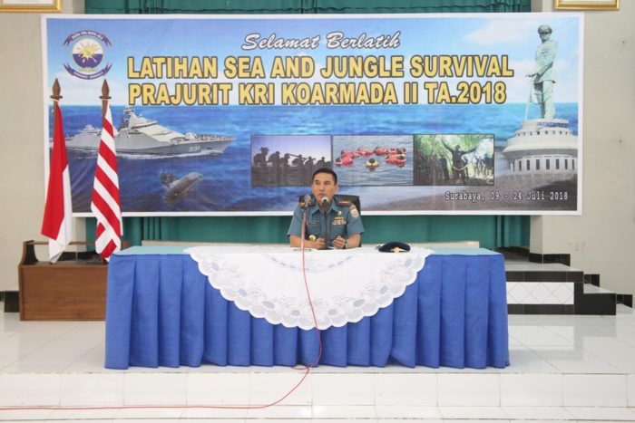 PB|Surabaya – Komandan Komando Latihan (Dankolat) Koarmada II, Kolonel Laut (P) Kisdiyanto di hari pertama Latihan Jungle and Survival Prajurit KRI Koarmada II TA. 2018, memberikan briefing kepada peserta latihan dari satuan kapal jajaran Koarmada II, bertempat di Gedung Mandalika Koarmada II, Ujung Surabaya. Senin, (09/07/2018).