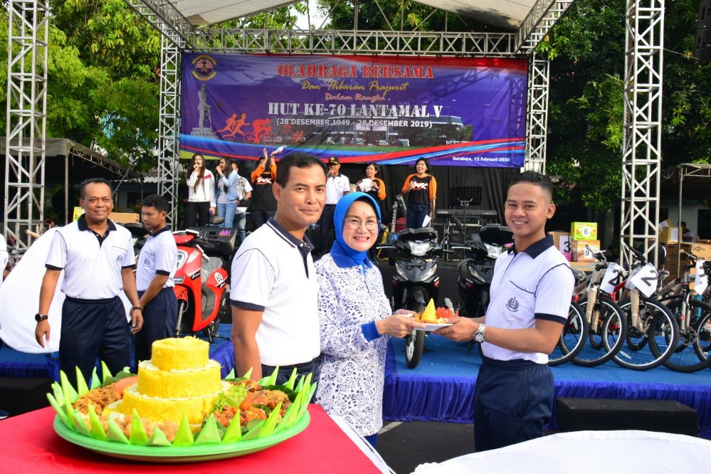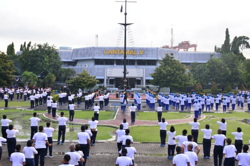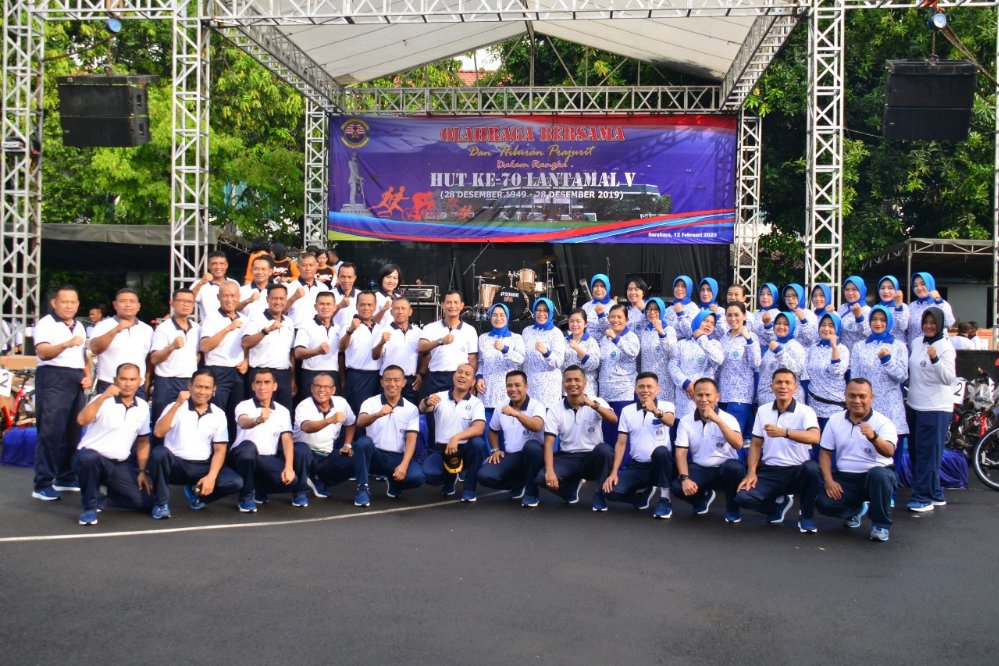 Surabaya – Dalam rangka memperingati Hari Jadinya yang ke – 70 Komandan Pangkalan Utama TNI AL (Danlantamal) V Laksma TNI Tedjo Sukmono, S.H., CHRMP., menggelar olah raga bersama dengan keluarga besar Lantamal V. Olahraga bersama yang diikuti segenap Parjurit, Pegawai Negeri Sipil (PNS) dan pengurus Jalasenastri tersebut di gelar di lapangan Apel Mako Lantamal V, Jl. M. Nasir No. 56 Surabaya, (12/2).