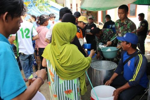 Sebelum tiba waktu makan, para pengungsi sudah mulai mendatangi Posko dapur umum Regu perbekalan dibantu oleh tim Kemensos yang sudah menyiapkan makanan untuk dibagikan kepada para pengungsi.
