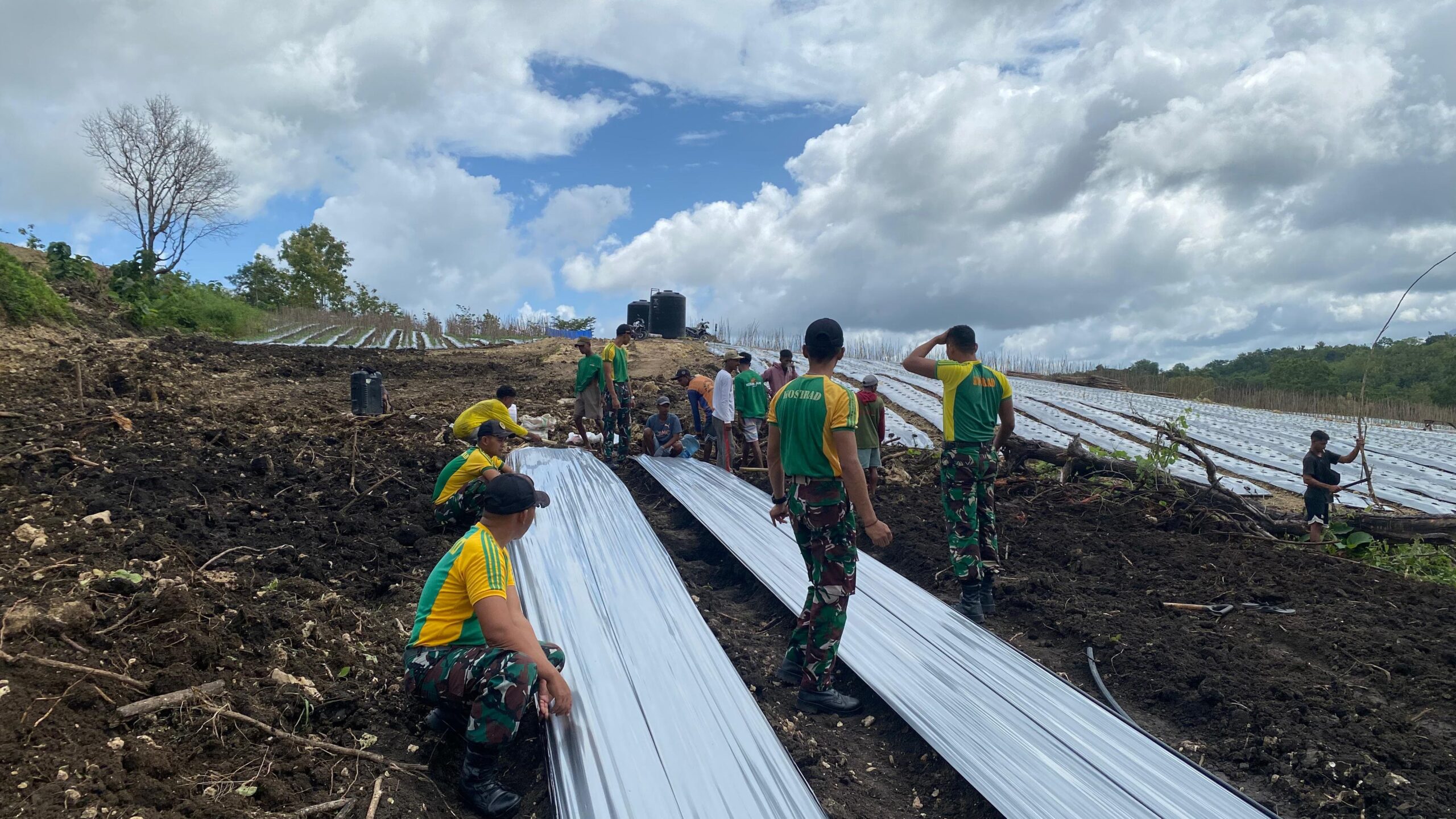 Belu – Komitmen dalam mendukung ketahanan pangan di wilayah perbatasan terus ditunjukkan Satgas Pamtas RI–RDTL Sektor Timur Yonarmed 12 Kostrad melalui Pos Dafala. Kali ini, personel Pos Dafala bersama masyarakat melaksanakan kegiatan gotong royong pemasangan plastik mulsa untuk budidaya tanaman tomat di lahan pertanian warga Desa Dafala, Kecamatan Tasifeto Timur, Kabupaten Belu, Kamis (09/04/2026).