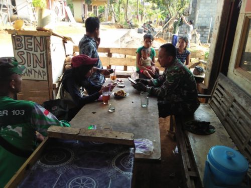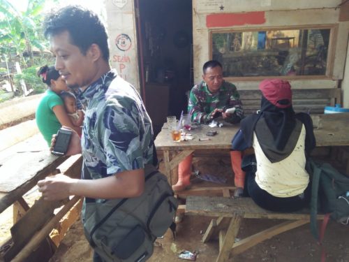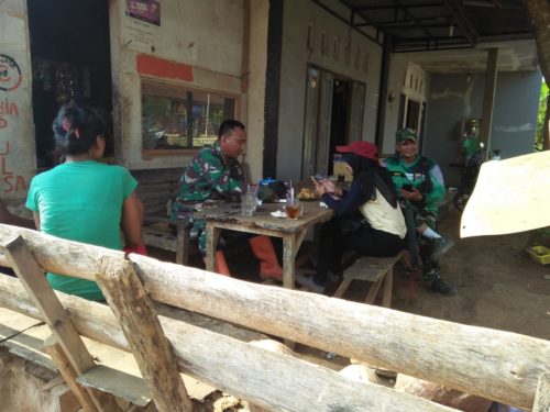 Terlihat Dina Indriyani (23) jilbab hitam, salah satu wartawan media online nasional menggali informasi dari Danramil 01/Subah Kodim Batang, Kapten Inf. Sugito di lokasi TMMD, di warung Rohkimah (23), warga sasaran TMMD, Desa Durenombo Kecamatan Subah. (kodim batang|red|noven)