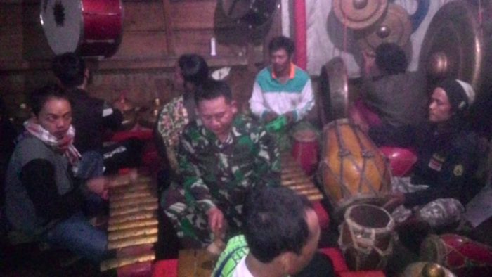Tampak Babinsa setempat dari Koramil 06 Kalibening Kodim 0704, Serda Suwondo bersama kelompok kesenian kuda lumping Langgeng Sari, asuhan Partono (54) warga Rt 02 Rw. 05 Dusun Karang Gondang Desa Pasegeran, melaksanakan latihan untuk tampil dalam pembukaan TMMD Reguler 102 Banjarnegara 10 Juli 2018 ini.(pendim0704bna|red)