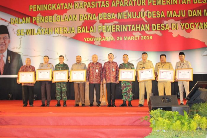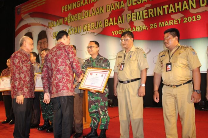 Yogyakarta – Komandan Pangkalan TNI AL (Danlanal) Yogyakarta, Lantamal V, Koaramda II, Letkol Marinir Bambang Adriantoro menerima piagam penghargaan dalam acara Peningkatan kapasitas aparatur pemerintah Desa dalam pengelolaan dana Desa menuju Desa maju dan mandiri sewilayah kerja Balai Pemerintah Desa D.I. Yogyakarta di Gedung Graha Pradipta Jogja Expo Center (JEC) Yogyakarta (26/3).