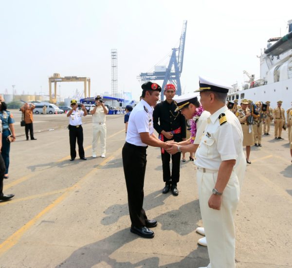 PB|Jakarta – Direktur Latihan Bakamla Laksamana Pertama TNI Eko Jokowiyono, S.E., M.Si. menyambut hangat kedatangan Japan Coast Guard (JCG) Commanding Officer of Tsugaru PLH 02 Capt. Suzuki Hirohisa yang baru saja menyandarkan kapalnya, di Dermaga Jakarta Internasional Container Terminal (JICT) 2 Pelabuhan Tanjung Priok, Jakarta Utara, Senin (9/7/2018).