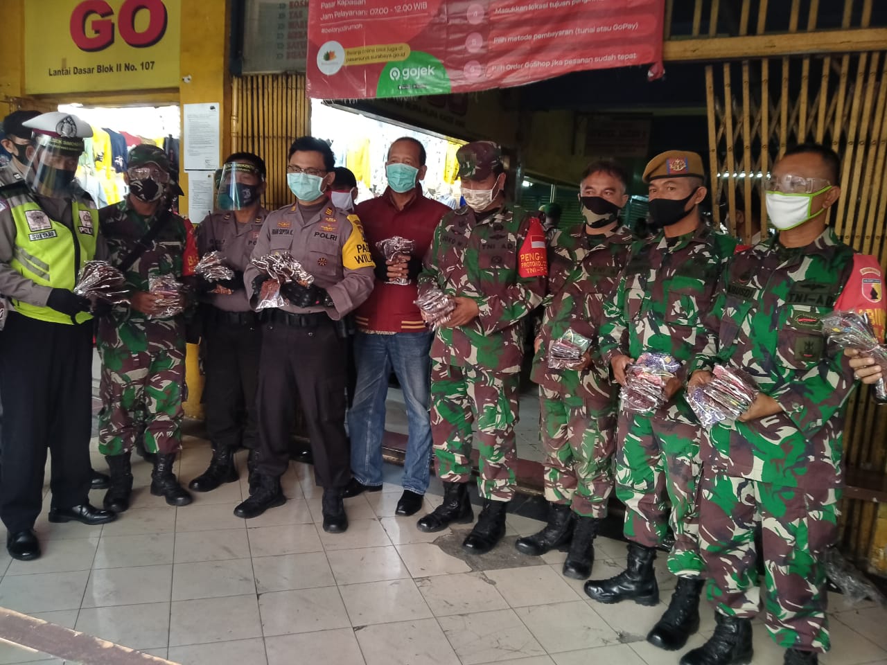 Surabaya – Untuk mengantisipasi dan mencegah penularan virus Corona atau Covid -19 di masyarakat, Koramil Simokerto membagikan masker gratis di pasar kapasan kelurahan Sidodadi Surabaya, minggu (28/06/2020).