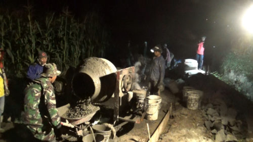 Gelapnya malam tak menyurutkan semangat para pekerja sukarela, dalam melaksanakan tugasnya. Guna efisiensi waktu, dalam mendorong adonan cor. Artco dan concrete mixer (molen) tetap dimainkan sebagai senjata utama mereka.