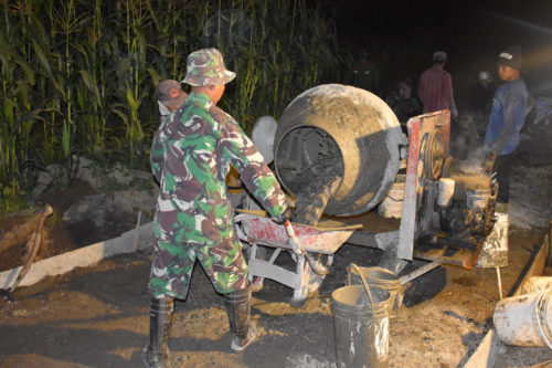 Banjarnegara – Merampungkan target 100 % rabat beton TMMD Reguler 102 Banjarnegara, Satgas TMMD bersama puluhan warga masyarakat Desa Pasegeran, melanjutkan perampungan pengecoran dalam mengejar target yang harus segera dicapai, kurang lebih 50 meter lagi.