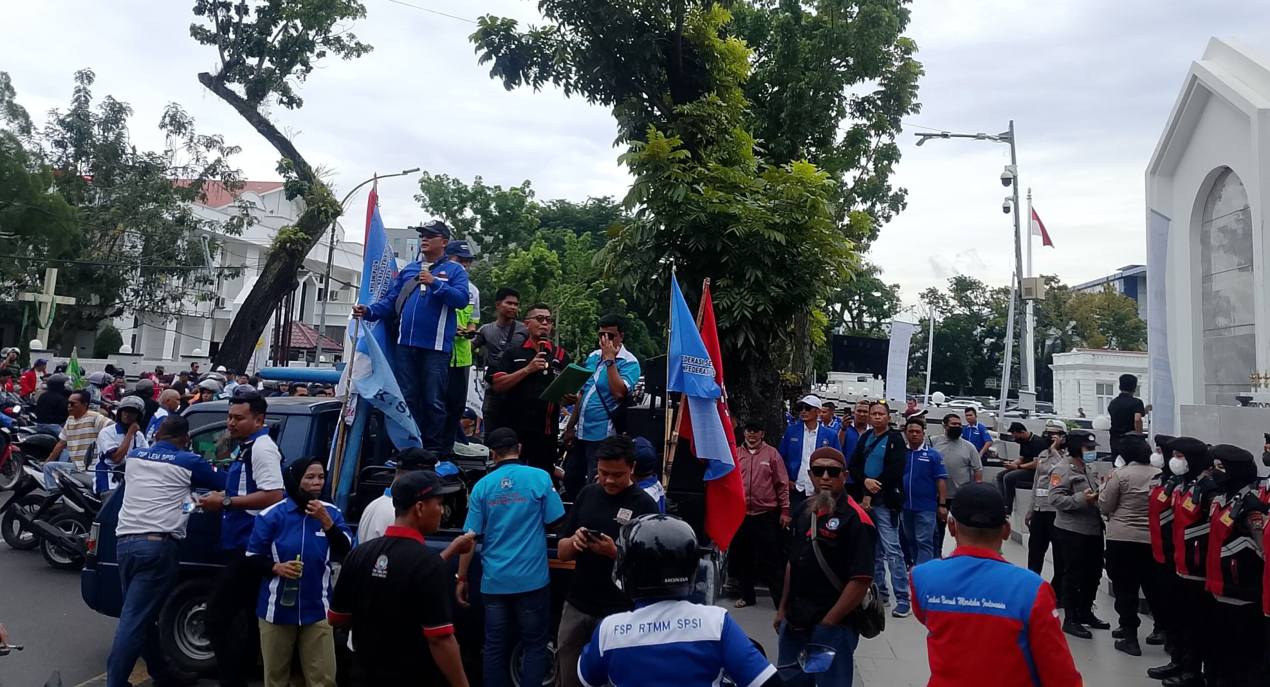 Setibanya di Kantor Gubernur Sumut sekitar pukul 10.55 WIB, massa langsung menggelar orasi. Habibul Hasil dari SBNI, Ahmad Rivai dari RTMM, serta Antoni Pasaribu dari SPTI menyampaikan aspirasi mereka terkait upah, PTKP, pengawasan ketenagakerjaan, jaminan sosial hingga stabilitas harga kebutuhan pokok. Pernyataan sikap kemudian dibacakan oleh Ahmad Rivai, sebelum diterima oleh pihak pemerintah yang diwakili Kadisnaker Sumut.