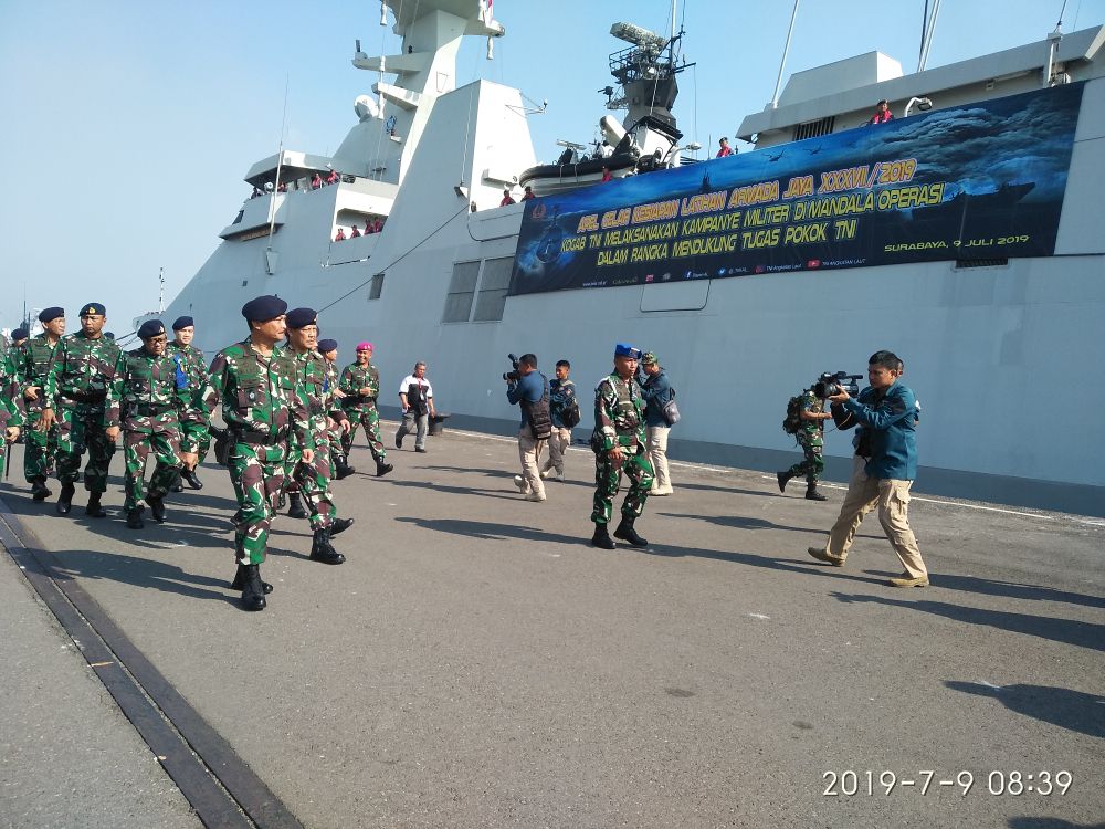 Surabaya – TNI Angkatan Laut melaksanakan Gelar Pasukan dalam rangka Manuvra Lapangan (Manlap) latihan tertinggi TNI AL Armada Jaya XXXVII Tahun 2019 di Dermaga Ujung Komando Armada (Koarmada) II Surabaya, Selasa (9/7). Latihan ini dalam rangka menguji hasil pembinaan latihan secara bertingkat dan berlanjut serta menyiapkan unsur-unsur dan prajurit TNI AL pada Latihan Gabungan (Latgab) TNI Tahun 2019. Kepala Staf Angkatan Laut (Kasal) Laksamana TNI Siwi Sukma Adji, S.E., M.M., melaksanakan inspeksi terhadap kesiapan unsur dan prajurit TNI AL yang dilibatkan.Latihan Armada Jaya XXXVII TA 2019 melibatkan 8.493 personel dengan rincian 1.959 personel pada tahap Geladi Posko dan 6.534 personel terlibat pada tahap Manuvra Lapangan. Para personel Manuvra Lapangan tersebut terbagi dalam beberapa Komando Tugas (Kogas), diantaranya Komando Tugas Laut Gabungan (Kogaslagab), Komando Tugas Gabungan Amfibi (Kogasgabfib), Komando Tugas Gabungan Pendaratan Administrasi (Kogasgabratmin) dan Komando Tugas Gabungan Pertahanan Pantai (Kogasgabhantai).