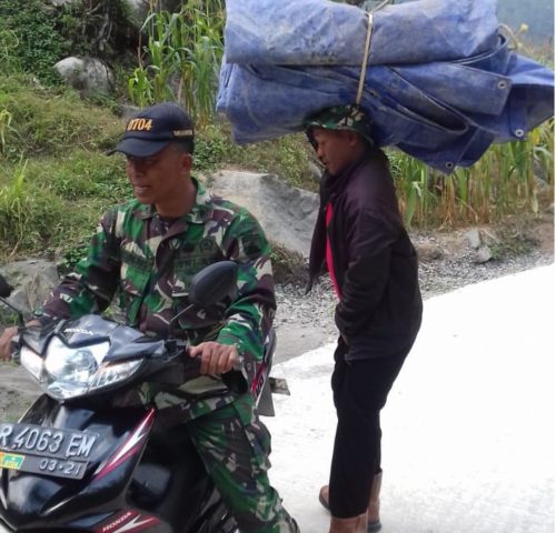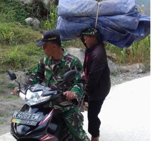 Kepekaan yang coba diimplementasikan Kaposramil Pandanarum di lapangan, Peltu Pojos (anggota Satgas TMMD) dalam memberikan tumpangan gojek kepada Retno Widodo (43) Panlak Pembangunan Desa Pasegeran yang terlihat sedang membawa terpal.