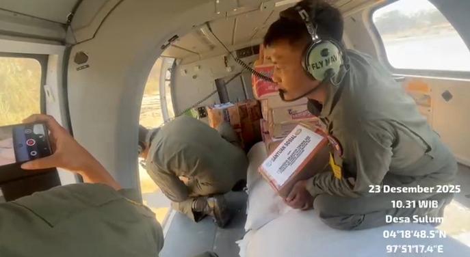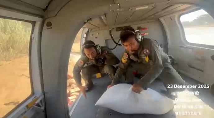 Aceh Tamiang, 23 Desember 2025 — TNI AL terus mendukung pemenuhan kebutuhan masyarakat serta membantu kelancaran distribusi logistik di wilayah terdampak keterbatasan akses, kali ini Pesawat Helikopter AS 565 MBe Panther dengan nomor lambung HS-1307 melaksanakan kegiatan Dorongan Logistik ke wilayah Desa Sulum, Aceh Tamiang, Selasa (23/12).