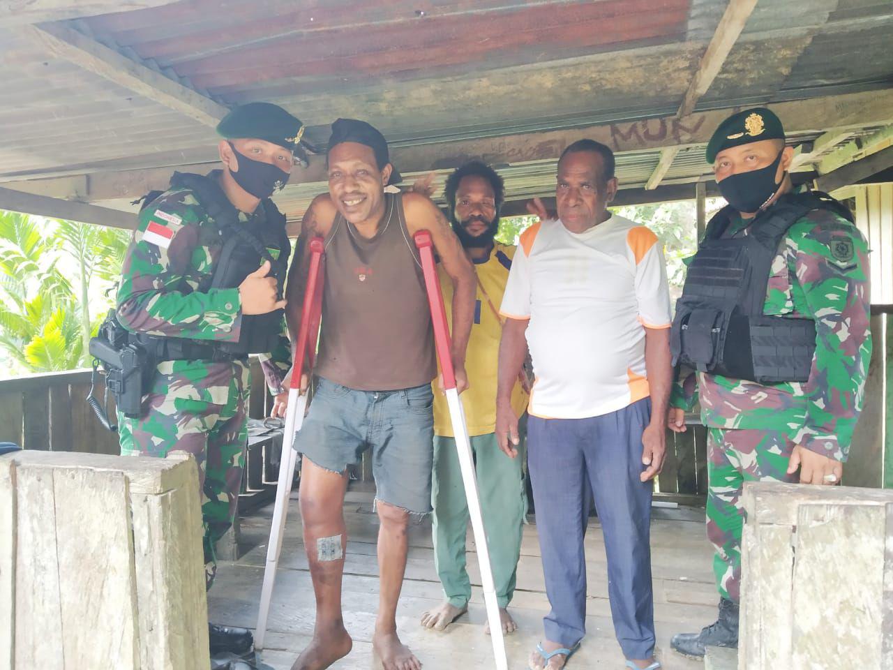 Bapak Frans (50) yang sejak seminggu lalu mendapatkan perawatan khusus dari Pos Satgas Skamto pada kaki kanannya yang mulai membusuk akibat luka infeksi serta mengeluarkan cairan nanah pada kakinya. Frans sendiri mengaku kesulitan untuk pengobatan kakinya, dimana jarak antara rumah dan Puskesmas mencapai 8 KM sedangkan ia sendiri tidak memiliki kendaraan pribadi serta belum dibuatnya kartu fasilitas pelayanan kesehatan untuk dirinya.Beruntung dengan kehadiran Satgas Pamtas RI-PNG Yonif Mekanis Raider 413 Kostrad saat ini hadir ditengah masyarakat Kampung Yowong yang intensif memberikan pengobatan keliling kepada masyarakat setempat. “Mulai seminggu yang lalu luka ini telah dibersihkan oleh Pos, hingga saat ini yang awalnya saya hanya terbaring kini bisa berdiri,” ujar Frans.