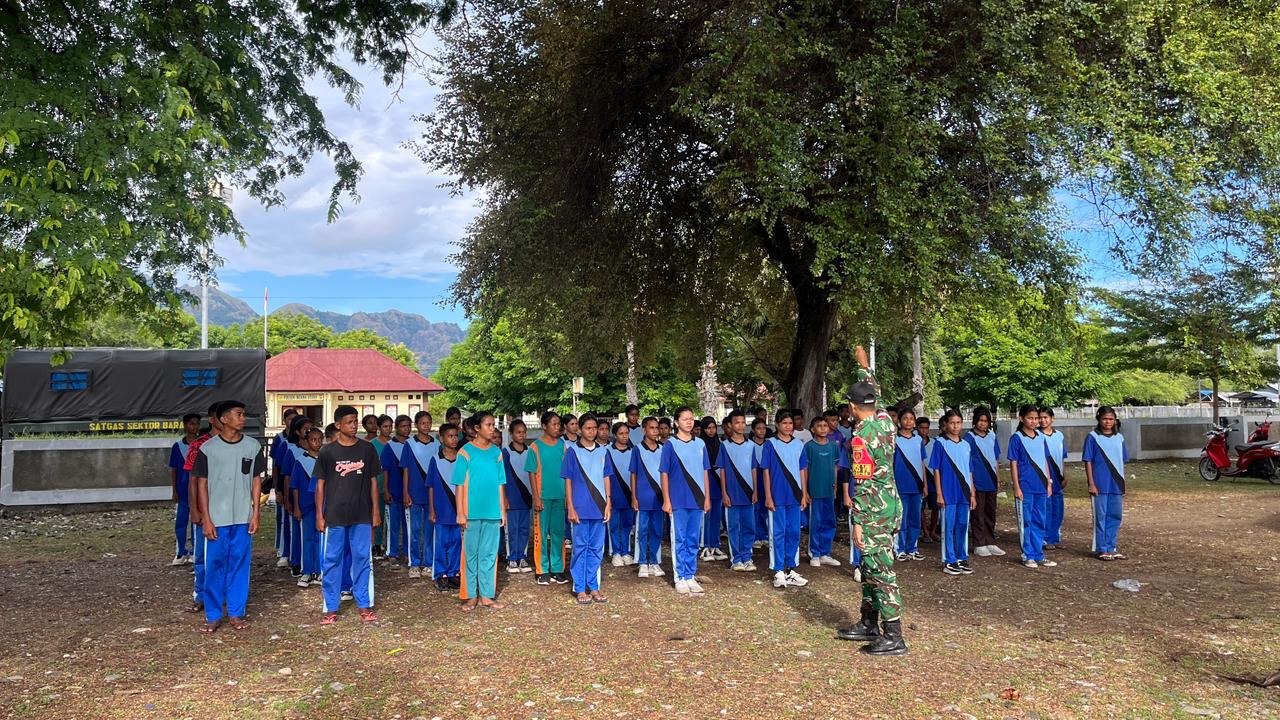 TTU – Satgas Pamtas RI-RDTL Sektor Barat Yonarhanud 2 Kostrad Pos Wini melibatkan siswa-siswi SMP Wini dengan mengombinasikan latihan Peraturan Baris Berbaris, aksi bersih pantai, hingga pembagian makanan bergizi dan buku cerita yang berlokasi di Pantai Wini, Kecamatan Insana Utara, Kabupaten TTU, Senin (13/04).