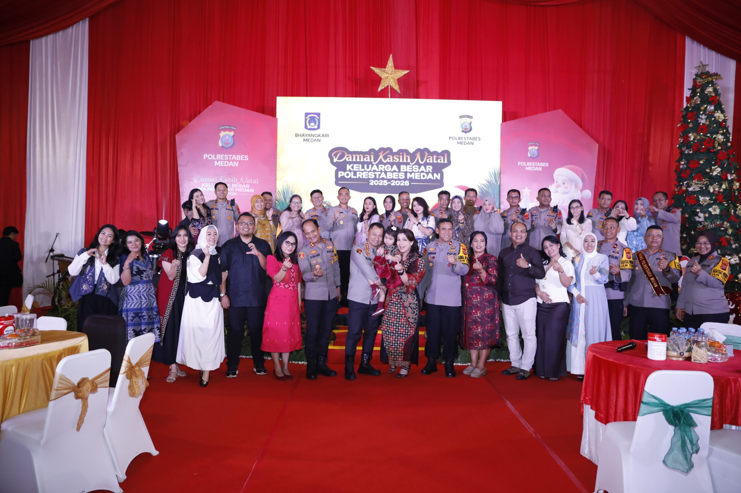 Medan – Suasana penuh sukacita dan kebersamaan mewarnai perayaan Natal Keluarga Besar Polrestabes Medan yang digelar di Lapangan Apel Polrestabes Medan, Jumat (26/12/2025) sore.