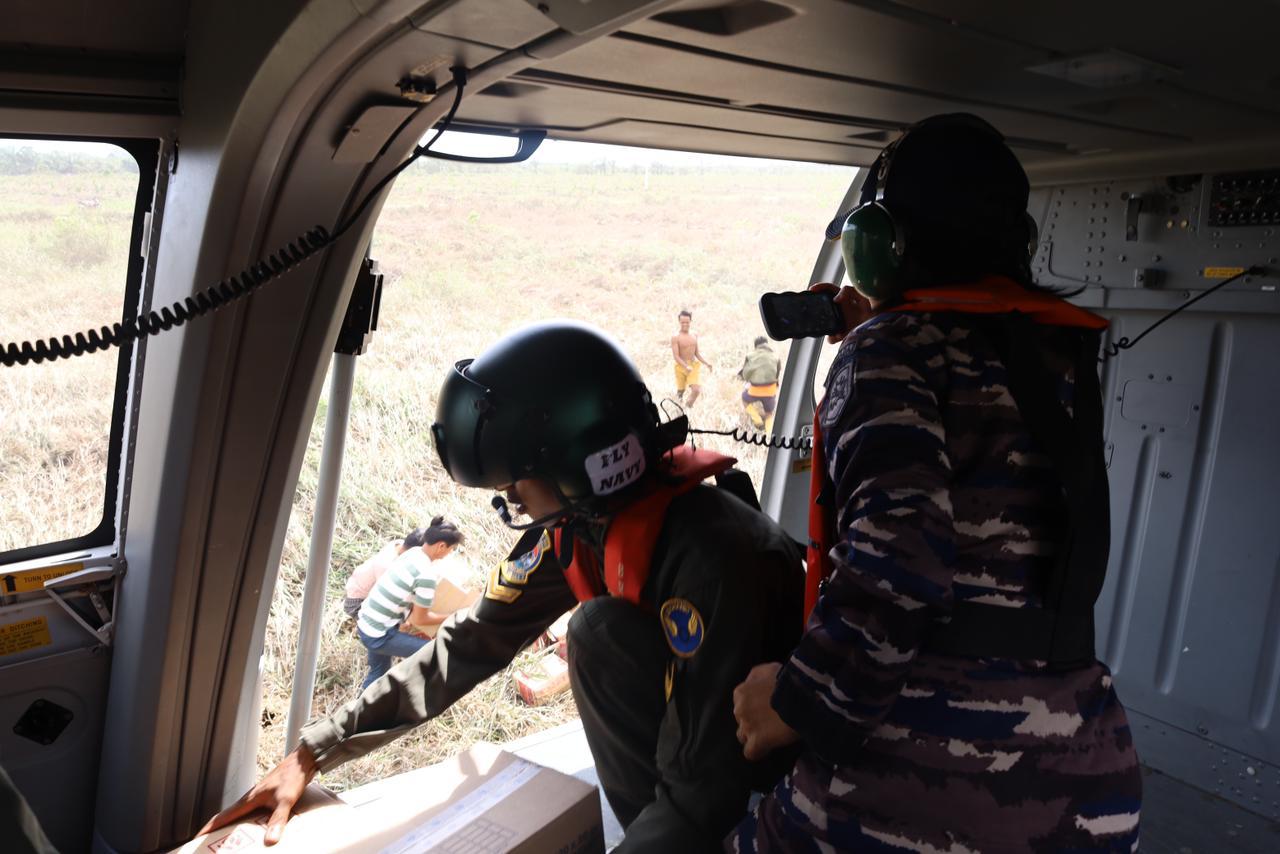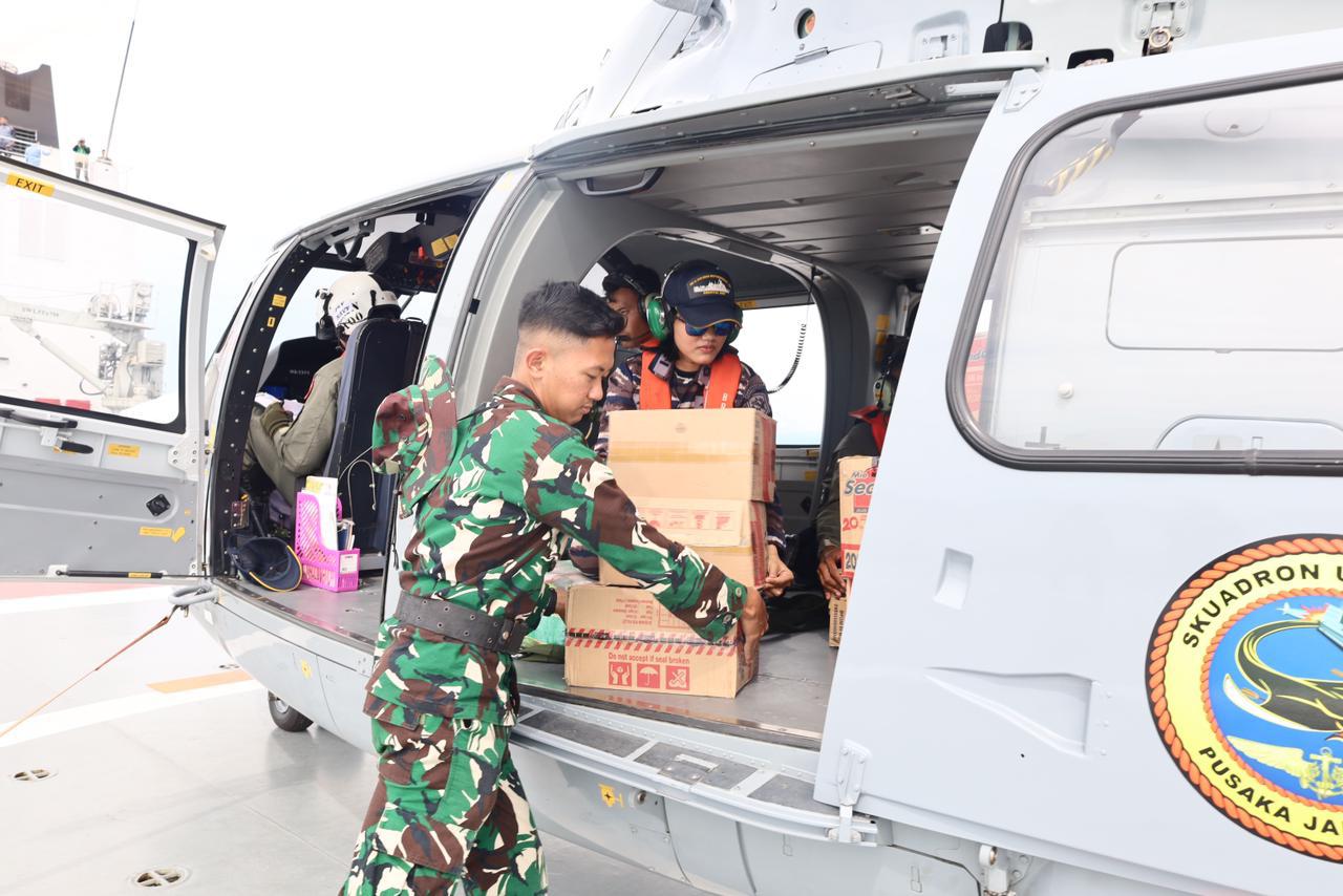 Sibolga, 5 Desember 2025–Salah satu Heli Panther TNI AL yang onboard di KRI dr. Radjiman Wedyodiningrat-992 (RJW) bergerak melaksanakan perbantuan distribusi logistik seperti beras, mie dan air mineral melalui udara menuju lokasi yang terdampak bencana di wilayah Sibolga, Kamis (4/12).