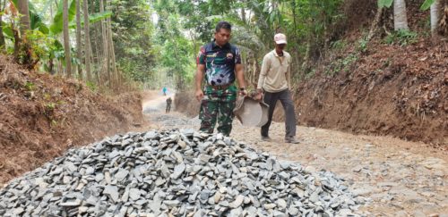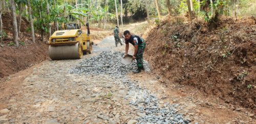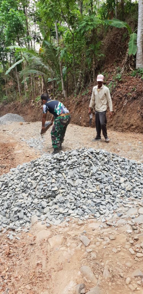 Batang – Memberikan motivasi kepada anggotanya, Dandim 0736 Batang, Letkol Kav Henry Napitupulu, ikut mencangkul material pecahan batu (sertu) kemudian diserahkan kepada warga untuk menguruk jalan.