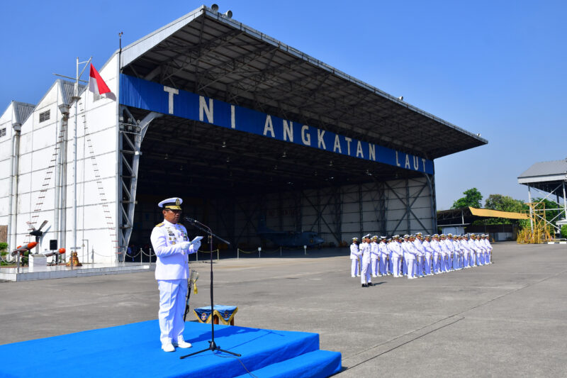 Sidoarjo – Inspektur Pusat Penerbangan TNl Angkatan Laut (Irpuspenerbal), Laksma TNl Johannes Tambunan mewakili Komandan Puspenernal, Laksda TNl Bayu Alisyahbana memimpin Upacara Peringatan HUT ke-80 TNl Tahun 2025 di Apron Pangkalan Udara TNl Angkatan Laut (Lanudal) Juanda, Sidoarjo, Minggu (5/10/2025).