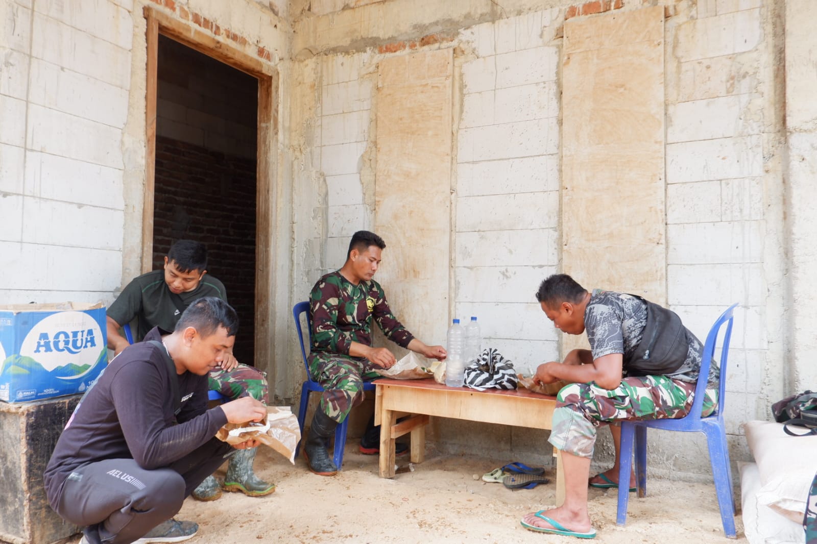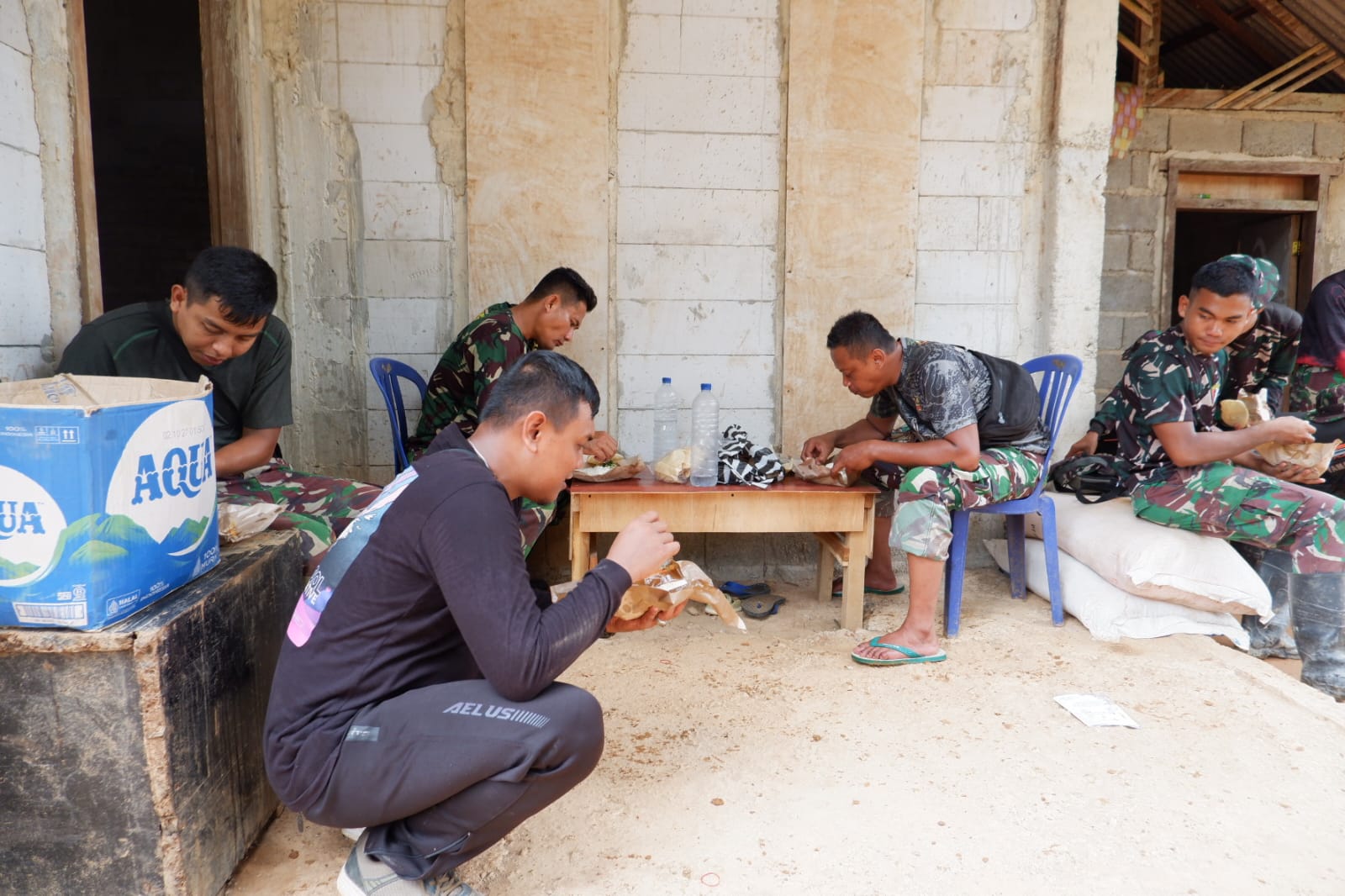 Tidak hanya saat melaksanakan pengerjaan kegiatan sasaran fisik, tetapi momen istirahat siang ini menjadi bukti nyata kebersamaan dan kekompakan antara warga dan anggota TNI. Semua bersatu dalam keseruan saat menikmati makan siang.