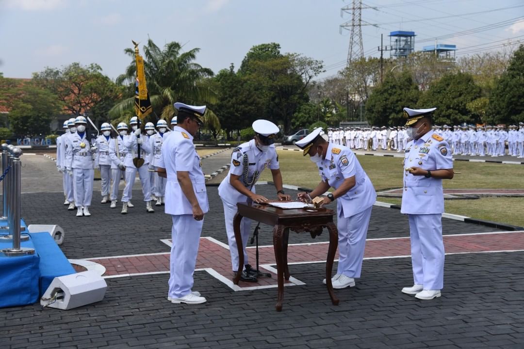 Panglima Koarmada II Laksamana Muda TNI Dr. T.S.N.B Hutabarat, M.M.S memimpin upacara serah terima jabatan Komandan Pangkalan Utama TNI Angkatan Laut (Danlantamal) V Surabaya di Lapangan Mako Lantamal V Surabaya, Sabtu (30/07/2022)