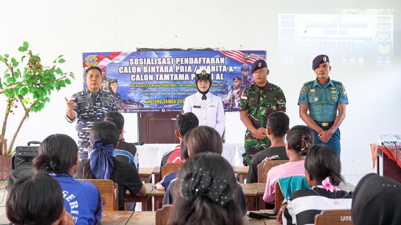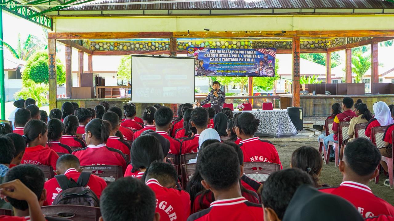 Ambon, Kodaeral IX (30/1/2026) – Guna menjaring bibit unggul dan pastikan seleksi penerimaan berjalan transfaran dari kalangan pelajar, Komando Daerah Angkatan Laut lX (Kodaeral IX) melaksanakan sosialisasi penerimaan calon prajurit TNI AL TA. 2026 di Wilayah Pesisir Pulau Seram Bagian Barat pada Jumat (30/1/2026).