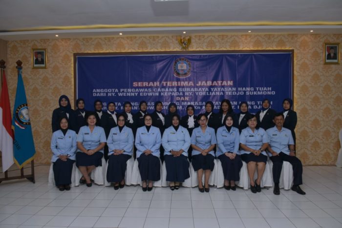 Surabaya – Jelang serah terima jabatannya, Ketua Korcab V DJA II Ny. Wenny Edwin yang juga sebagai Pengawas Cabang Surabaya Yayasan Hang Tuah (YHT), menggelar acara pisah kenal dengan para pengurus YHT di Aula Korcab Mako Lantamal V Rabu (17/7).