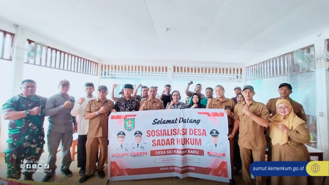 Medan — Kantor Wilayah Kementerian Hukum Sumatera Utara pastikan layanan Posbankum berjalan optimal di Kabupaten Asahan dengan melaksanakan Sosialisasi Pos Bantuan Hukum di Desa Sei Kamah Baru dan Sei Alim Hasak, Kecamatan Sei Dadap, Kabupaten Asahan, Senin (29/09/2025).