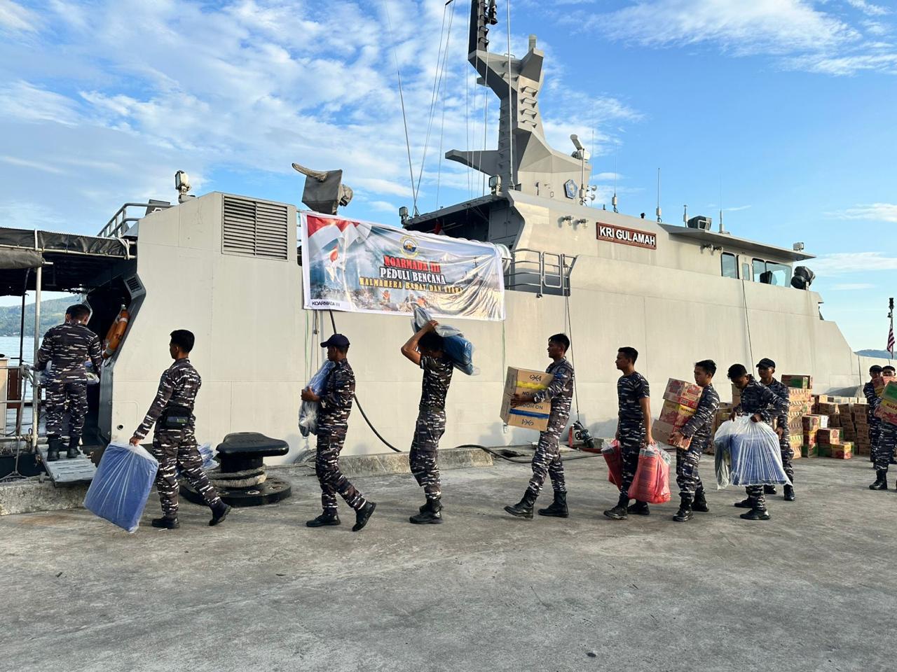 Halmahera, 21 Januari 2026,—Setelah sebelumnya pekan lalu penyaluran bantuan berupa bahan kontak menggunakan KRI Dorang-874, kali ini TNI AL kembali menyalurkan bantuan kemanusiaan menggunakan KRI Gulamah-869 kepada korban terdampak bencana alam di Halmahera Barat dan Utara di Pelabuhan Tobelo. Rabu (21/1).