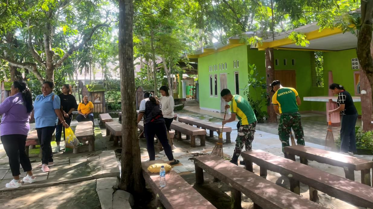Karya bakti tersebut difokuskan pada pembersihan halaman gereja, termasuk pemangkasan rumput liar dan penataan lingkungan sekitar. Personel Satgas bersama warga setempat bergotong royong menciptakan lingkungan gereja yang bersih, rapi, dan nyaman untuk digunakan dalam kegiatan peribadatan.