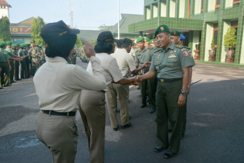 PB | Madiun – Kepala Staf Korem 081/Dhirotsaha Jaya Letkol Inf Akhyari,S.IP. memimpin kegiatan Halal Bihalal 1437 H/2016 M di halaman depan Makorem 081/DSJ Jln. Pahlawan No.50 Kota Madiun.Senin(11/7/16)Dengan diiringi lagu-lagu Shlawatan, Halal Bihalal yang dilaksanakan secara sederhana dan dikuti oleh seluruh anggota Makorem 081/DSJ, Kodim 0803/Madiun dan Satdisjan wilayah Madiun tersebut merupakan tradisi yang dilaksanakan setiap tahun setelah melaksanakan satu bulan penuh berpuasa pada bulan Ramadhan. Kegiatan dilaksanakan setelah anggota baik Militer maupun ASN selesai melaksanakan cuti lebaran baik gelombang 1 maupun gelombang. Kegiatan dilaksanakan setelah pelaksanaan Upacara Bendera hari senin.