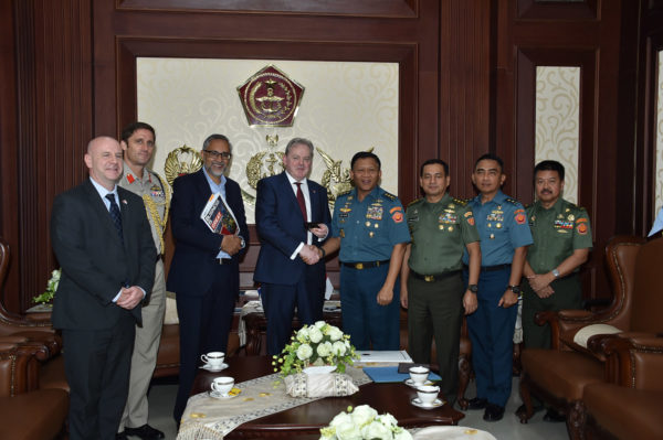 Delegasi Inggris dipimpin Menteri Muda bidang Pengadaan Pertahanan Inggris, Mr. Guto Bebb MP didampingi Dubes Inggris untuk Indonesia, ASEAN dan Timor Leste H.E. Mr. Moazam Malik, Athan Inggris untuk Indonesia Col. Jaimie Roylance dan staf kedutaan Inggris di Jakarta.(Puspen TNI|red)