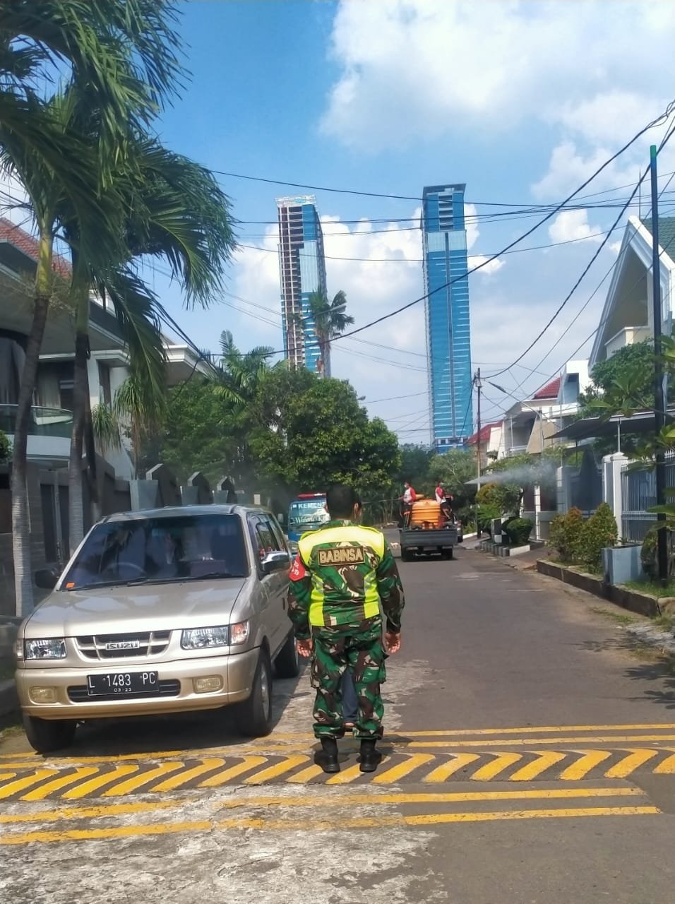 Dalam rangka memutus mata rantai penyebaran wabah Corona, anggota Koramil 04/Sukolilo jajaran kodim 0831/Surabaya Timur Sertu Sukirman melakukan pendampingan penyemprotan cairan disinfektan di perumahan Drama Husada Indah Blok D Rt 03 Rw 09 Kelurahan Mulyorejo kecamatan Mulyorejo,surabaya dalam rangka memutus mata rantai penyebaran virus Covid – 19.Rabu (24/21).