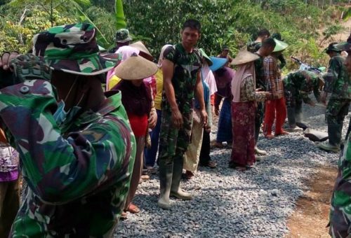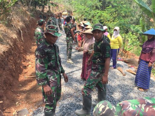 Tampak kerumunan Ibu-ibu dan sejumlah prajurit terus menggenjot melanjutkan pengerasan langsir split untuk ditabur dan diratakan pada jalan sebelum dilindas vibro roller dan terakhir disiram aspal cair/ter. Minggu (21/10/18).