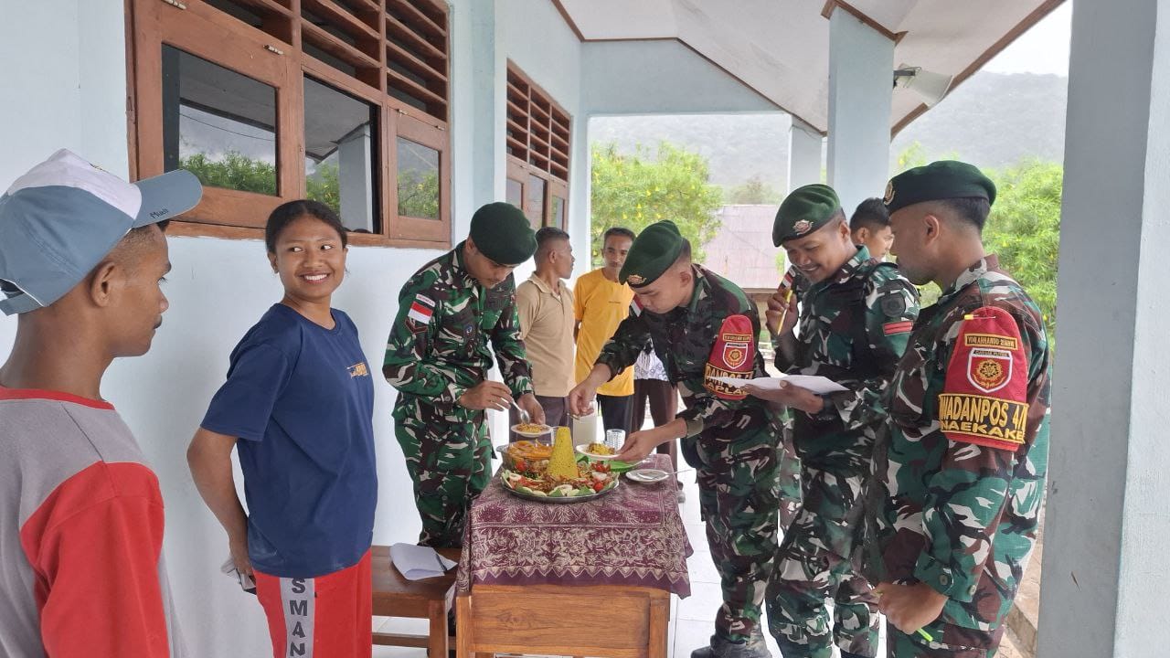TTU – Satgas Pamtas RI-RDTL Sektor Barat Yonarhanud 2 Kostrad Pos Aplal, Naekake dan Oelbinose memberikan kejutan di momen Hari Guru Nasional di SMAN Mutis, Kecamatan Mutis, Kabupaten TTU, Selasa (25/11/2025).