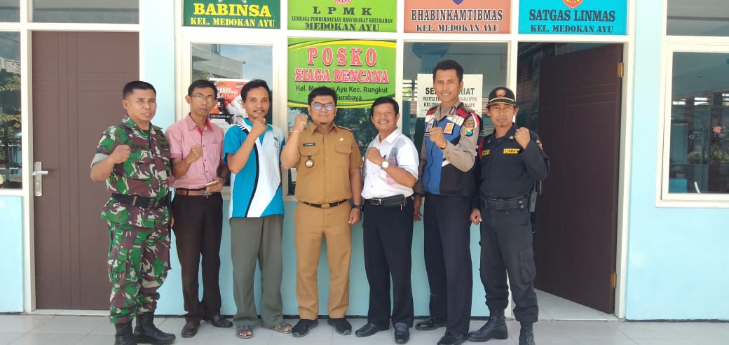 Surabaya – Lurah Medokan Ayu, Ahmad Yardo Wifaqo, S.AP., M.AP mengadakan Rapat Koordinasi terkait pembentukan Posko Siaga Bencana di Kantor Kelurahan Medokan Ayu dengan kolaborasi bersama Ketua LPMK (Lembaga Pemberdayaan Masyarakat Kelyrahan), Suhardi, Babinsa (Bintara Pembina Desa) Koramil 0831/05 Rungkut, Serka Jupri dan Bhabinkamtibmas (Bhayangkara Pembina Keamanan dan Ketertiban Masyarakat) Polsek Rungkut, Bripka Sofian. Pembentukan Posko tersebut swbagai aplikasi dari instruksi Walikota Surabaya yang bertujuan untuk menjalin kebersamaan 3 pilar plus ditingkat kelurahan agar warga masyarakat lebih aman dan kondusif (15/10/18).
