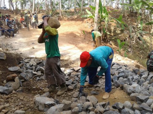 Batang – Seorang warga Dukuh Durensari Desa Durenombo Rt 03 Rw 03 Rasmudi (54) dengan semangat mengangkat batu untuk membantu pengerjaan jalan dalam Program Pra Tentara Manunggal Membangun Desa (TMMD). Selain Rasmudi beberapa warga lainya juga ikut membantu mensukska Pra TMMD Reguler ke – 103 Kodim 0736 Batang.