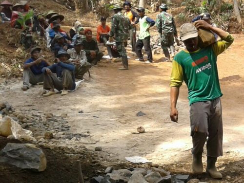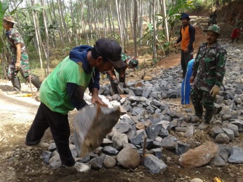 Batang – Seorang warga Dukuh Durensari Desa Durenombo Rt 03 Rw 03 Rasmudi (54) dengan semangat mengangkat batu untuk membantu pengerjaan jalan dalam Program Pra Tentara Manunggal Membangun Desa (TMMD). Selain Rasmudi beberapa warga lainya juga ikut membantu mensukska Pra TMMD Reguler ke – 103 Kodim 0736 Batang.