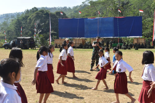 Banjarnegara – Sehari menjelang penutupan TMMD Reguler ke-102 Kodim 0704 Banjarnegara, puluhan anak-anak SDN 1 Pasegeran melaksanakan gladi atau latihan pementasan kesenian kuda lumping di Lapangan Desa Pasegeran Kecamatan Pandanarum. Selasa (7/8/18).